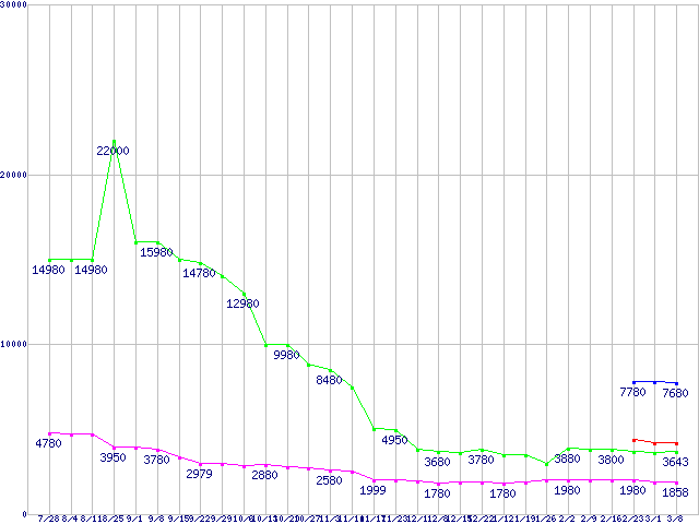 PC2-6400(DDR2-800) DDR2 SDRAM DIMMの最安値推移