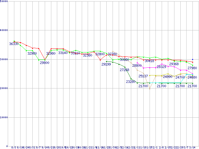 | CPU主要製品(最安値2万円~3万円未満)の最安値推移 | | | (2007年8月3日~2008年3月14日) |