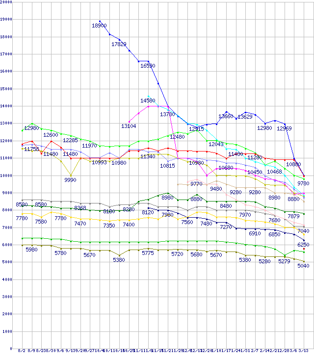 | HDD/SSD主要製品(最安値1万円未満)の最安値推移 | | | (2007年8月2日~2008年3月13日) |