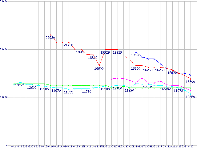 HDD/SSD主要製品(最安値1万円~1万5千円未満)の最安値推移