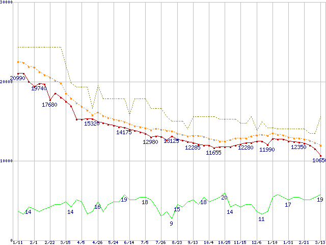 ※このグラフは過去のデータも税率5%相当に調整した税込み相当額のグラフです。 税率変更や、総額表示方式導入(2004年4月)の影響は除いています。 | | | ●凡例 | 最安値 (点線部は販売店未確認 または未調査) | 平均値 | 最高値 | ショップ数 |