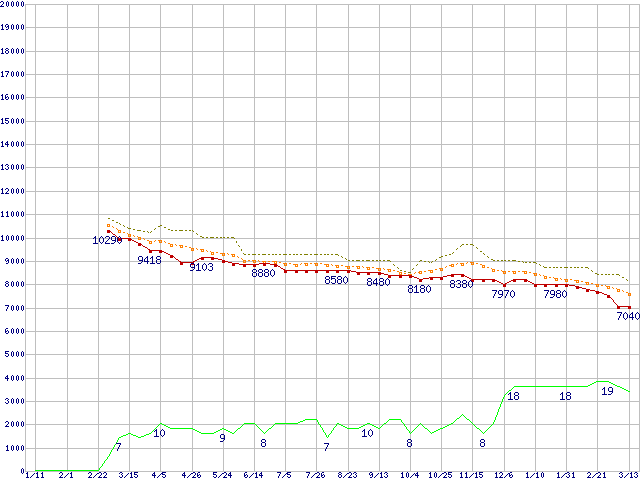 ※このグラフは過去のデータも税率5%相当に調整した税込み相当額のグラフです。 税率変更や、総額表示方式導入(2004年4月)の影響は除いています。 | | | ●凡例 | 最安値 (点線部は販売店未確認 または未調査) | 平均値 | 最高値 | ショップ数 |