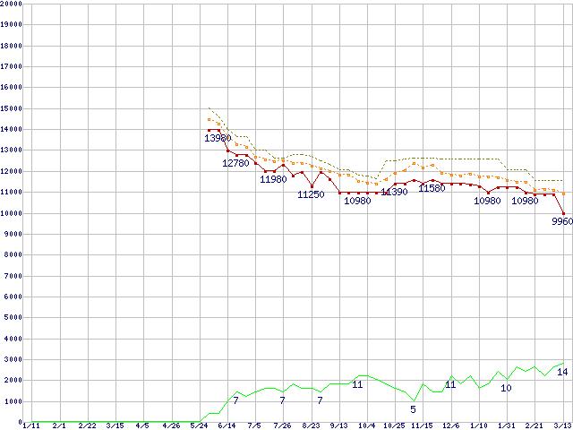 ※このグラフは過去のデータも税率5%相当に調整した税込み相当額のグラフです。 税率変更や、総額表示方式導入(2004年4月)の影響は除いています。 | | | ●凡例 | 最安値 (点線部は販売店未確認 または未調査) | 平均値 | 最高値 | ショップ数 |