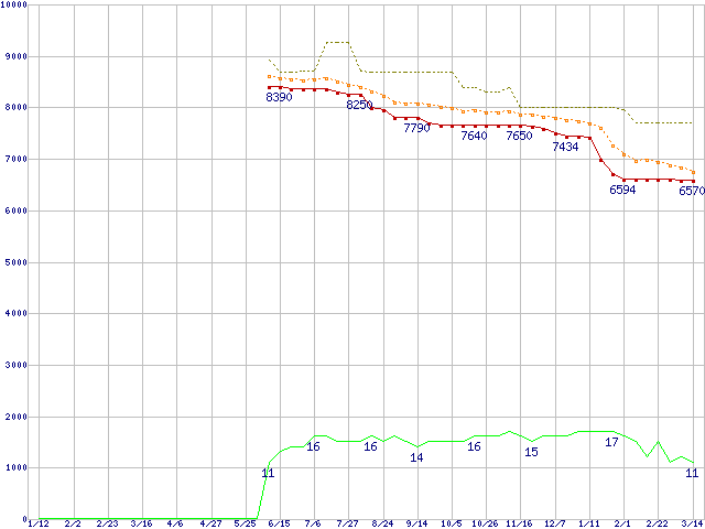※このグラフは過去のデータも税率5%相当に調整した税込み相当額のグラフです。 税率変更や、総額表示方式導入(2004年4月)の影響は除いています。 | | | ●凡例 | 最安値 (点線部は販売店未確認 または未調査) | 平均値 | 最高値 | ショップ数 |