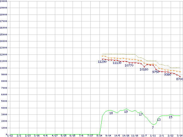 ※このグラフは過去のデータも税率5%相当に調整した税込み相当額のグラフです。 税率変更や、総額表示方式導入(2004年4月)の影響は除いています。 | | | ●凡例 | 最安値 (点線部は販売店未確認 または未調査) | 平均値 | 最高値 | ショップ数 |