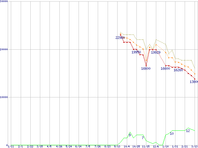 ※このグラフは過去のデータも税率5%相当に調整した税込み相当額のグラフです。 税率変更や、総額表示方式導入(2004年4月)の影響は除いています。 | | | ●凡例 | 最安値 (点線部は販売店未確認 または未調査) | 平均値 | 最高値 | ショップ数 |