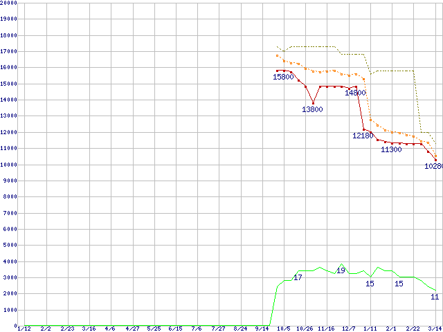 ※このグラフは過去のデータも税率5%相当に調整した税込み相当額のグラフです。 税率変更や、総額表示方式導入(2004年4月)の影響は除いています。 | | | ●凡例 | 最安値 (点線部は販売店未確認 または未調査) | 平均値 | 最高値 | ショップ数 |