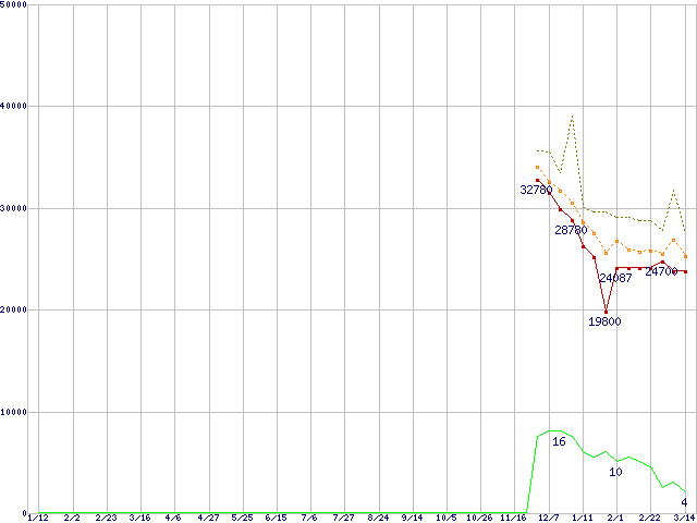 ※このグラフは過去のデータも税率5%相当に調整した税込み相当額のグラフです。 税率変更や、総額表示方式導入(2004年4月)の影響は除いています。 | | | ●凡例 | 最安値 (点線部は販売店未確認 または未調査) | 平均値 | 最高値 | ショップ数 |