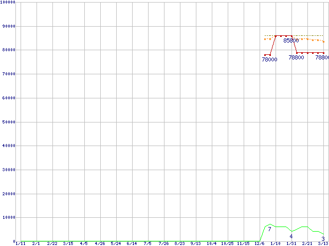 ※このグラフは過去のデータも税率5%相当に調整した税込み相当額のグラフです。 税率変更や、総額表示方式導入(2004年4月)の影響は除いています。 | | | ●凡例 | 最安値 (点線部は販売店未確認 または未調査) | 平均値 | 最高値 | ショップ数 |