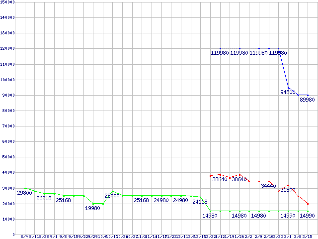 PC3-12800(DDR3-1600) DDR3 SDRAM DIMMの最安値推移