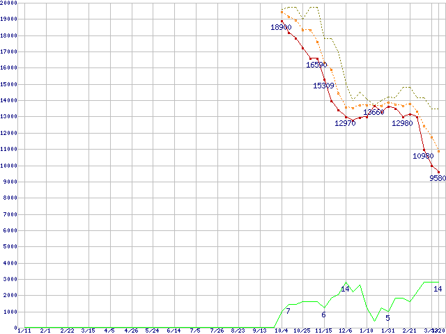 ※このグラフは過去のデータも税率5%相当に調整した税込み相当額のグラフです。 税率変更や、総額表示方式導入(2004年4月)の影響は除いています。 | | | ●凡例 | 最安値 (点線部は販売店未確認 または未調査) | 平均値 | 最高値 | ショップ数 |