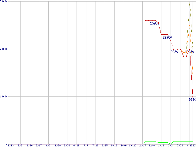 ※このグラフは過去のデータも税率5%相当に調整した税込み相当額のグラフです。 税率変更や、総額表示方式導入(2004年4月)の影響は除いています。 | | | ●凡例 | 最安値 (点線部は販売店未確認 または未調査) | 平均値 | 最高値 | ショップ数 |