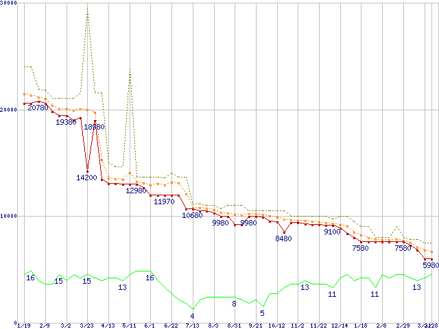 ※このグラフは過去のデータも税率5%相当に調整した税込み相当額のグラフです。 税率変更や、総額表示方式導入(2004年4月)の影響は除いています。 | | | ●凡例 | 最安値 (点線部は販売店未確認 または未調査) | 平均値 | 最高値 | ショップ数 |