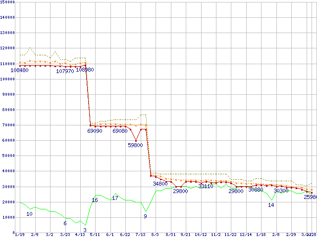 ※このグラフは過去のデータも税率5%相当に調整した税込み相当額のグラフです。 税率変更や、総額表示方式導入(2004年4月)の影響は除いています。 | | | ●凡例 | 最安値 (点線部は販売店未確認 または未調査) | 平均値 | 最高値 | ショップ数 |