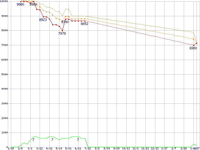 ※このグラフは過去のデータも税率5%相当に調整した税込み相当額のグラフです。 税率変更や、総額表示方式導入(2004年4月)の影響は除いています。 | | | ●凡例 | 最安値 (点線部は販売店未確認 または未調査) | 平均値 | 最高値 | ショップ数 |