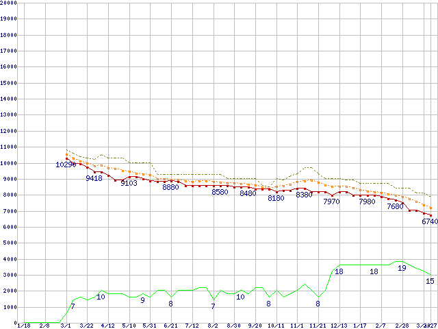 ※このグラフは過去のデータも税率5%相当に調整した税込み相当額のグラフです。 税率変更や、総額表示方式導入(2004年4月)の影響は除いています。 | | | ●凡例 | 最安値 (点線部は販売店未確認 または未調査) | 平均値 | 最高値 | ショップ数 |