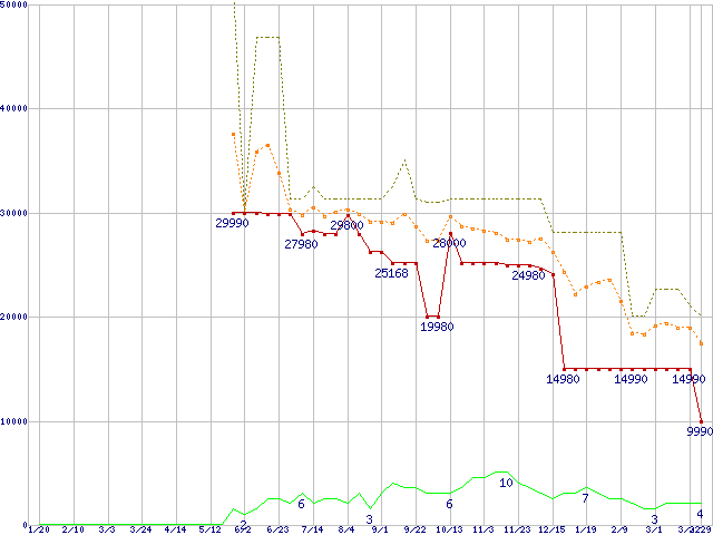 ※このグラフは過去のデータも税率5%相当に調整した税込み相当額のグラフです。 税率変更や、総額表示方式導入(2004年4月)の影響は除いています。 | | | ●凡例 | 最安値 (点線部は販売店未確認 または未調査) | 平均値 | 最高値 | ショップ数 |