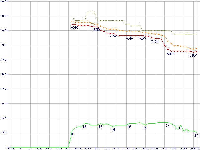 ※このグラフは過去のデータも税率5%相当に調整した税込み相当額のグラフです。 税率変更や、総額表示方式導入(2004年4月)の影響は除いています。 | | | ●凡例 | 最安値 (点線部は販売店未確認 または未調査) | 平均値 | 最高値 | ショップ数 |
