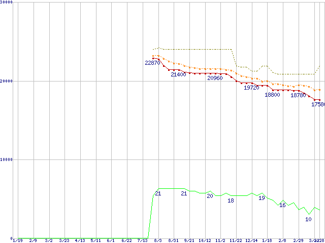 ※このグラフは過去のデータも税率5%相当に調整した税込み相当額のグラフです。 税率変更や、総額表示方式導入(2004年4月)の影響は除いています。 | | | ●凡例 | 最安値 (点線部は販売店未確認 または未調査) | 平均値 | 最高値 | ショップ数 |