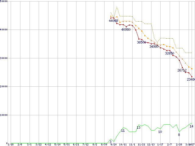 ※このグラフは過去のデータも税率5%相当に調整した税込み相当額のグラフです。 税率変更や、総額表示方式導入(2004年4月)の影響は除いています。 | | | ●凡例 | 最安値 (点線部は販売店未確認 または未調査) | 平均値 | 最高値 | ショップ数 |
