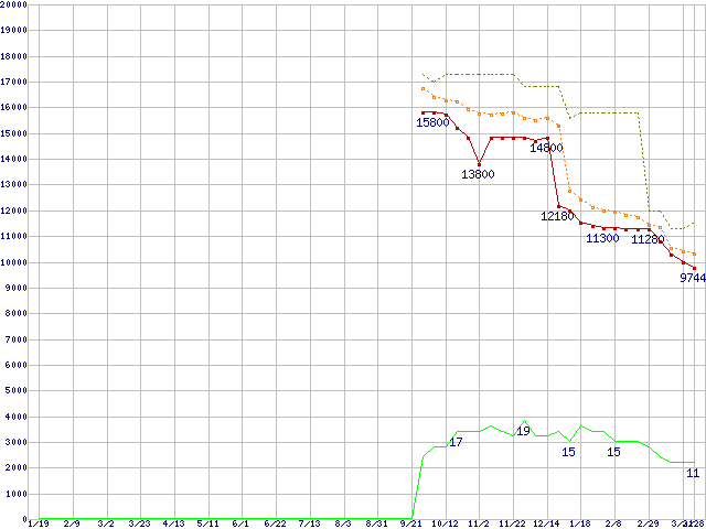 ※このグラフは過去のデータも税率5%相当に調整した税込み相当額のグラフです。 税率変更や、総額表示方式導入(2004年4月)の影響は除いています。 | | | ●凡例 | 最安値 (点線部は販売店未確認 または未調査) | 平均値 | 最高値 | ショップ数 |