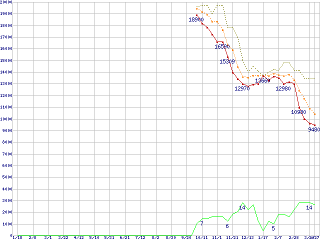 ※このグラフは過去のデータも税率5%相当に調整した税込み相当額のグラフです。 税率変更や、総額表示方式導入(2004年4月)の影響は除いています。 | | | ●凡例 | 最安値 (点線部は販売店未確認 または未調査) | 平均値 | 最高値 | ショップ数 |