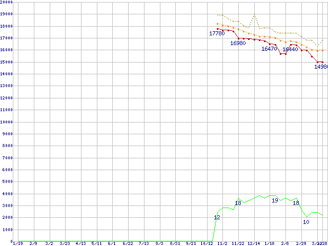 ※このグラフは過去のデータも税率5%相当に調整した税込み相当額のグラフです。 税率変更や、総額表示方式導入(2004年4月)の影響は除いています。 | | | ●凡例 | 最安値 (点線部は販売店未確認 または未調査) | 平均値 | 最高値 | ショップ数 |