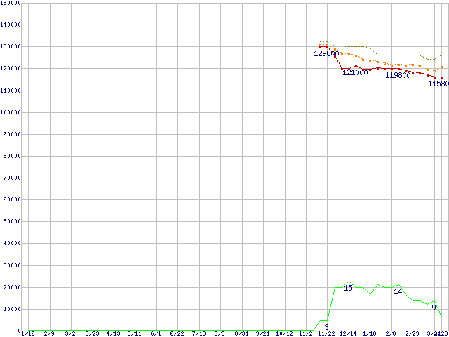 ※このグラフは過去のデータも税率5%相当に調整した税込み相当額のグラフです。 税率変更や、総額表示方式導入(2004年4月)の影響は除いています。 | | | ●凡例 | 最安値 (点線部は販売店未確認 または未調査) | 平均値 | 最高値 | ショップ数 |
