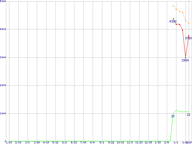 ※このグラフは過去のデータも税率5%相当に調整した税込み相当額のグラフです。 税率変更や、総額表示方式導入(2004年4月)の影響は除いています。 | | | ●凡例 | 最安値 (点線部は販売店未確認 または未調査) | 平均値 | 最高値 | ショップ数 |