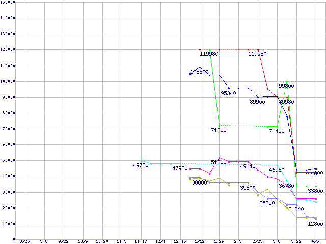 メモリ主要製品(最安値1万円以上)の最安値推移
