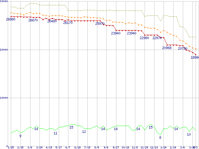 ※このグラフは過去のデータも税率5%相当に調整した税込み相当額のグラフです。 税率変更や、総額表示方式導入(2004年4月)の影響は除いています。 | | | ●凡例 | 最安値 (点線部は販売店未確認 または未調査) | 平均値 | 最高値 | ショップ数 |