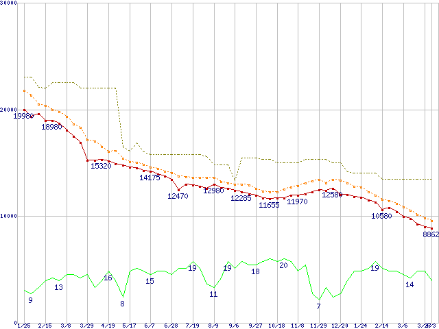 ※このグラフは過去のデータも税率5%相当に調整した税込み相当額のグラフです。 税率変更や、総額表示方式導入(2004年4月)の影響は除いています。 | | | ●凡例 | 最安値 (点線部は販売店未確認 または未調査) | 平均値 | 最高値 | ショップ数 |