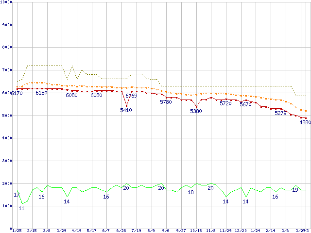 ※このグラフは過去のデータも税率5%相当に調整した税込み相当額のグラフです。 税率変更や、総額表示方式導入(2004年4月)の影響は除いています。 | | | ●凡例 | 最安値 (点線部は販売店未確認 または未調査) | 平均値 | 最高値 | ショップ数 |