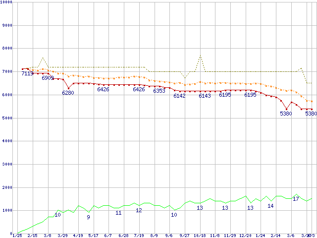 ※このグラフは過去のデータも税率5%相当に調整した税込み相当額のグラフです。 税率変更や、総額表示方式導入(2004年4月)の影響は除いています。 | | | ●凡例 | 最安値 (点線部は販売店未確認 または未調査) | 平均値 | 最高値 | ショップ数 |