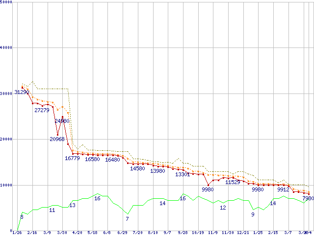 ※このグラフは過去のデータも税率5%相当に調整した税込み相当額のグラフです。 税率変更や、総額表示方式導入(2004年4月)の影響は除いています。 | | | ●凡例 | 最安値 (点線部は販売店未確認 または未調査) | 平均値 | 最高値 | ショップ数 |