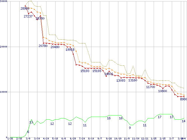 ※このグラフは過去のデータも税率5%相当に調整した税込み相当額のグラフです。 税率変更や、総額表示方式導入(2004年4月)の影響は除いています。 | | | ●凡例 | 最安値 (点線部は販売店未確認 または未調査) | 平均値 | 最高値 | ショップ数 |