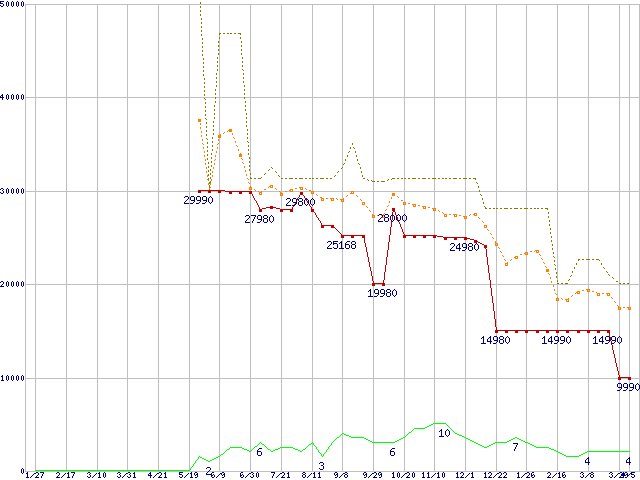 ※このグラフは過去のデータも税率5%相当に調整した税込み相当額のグラフです。 税率変更や、総額表示方式導入(2004年4月)の影響は除いています。 | | | ●凡例 | 最安値 (点線部は販売店未確認 または未調査) | 平均値 | 最高値 | ショップ数 |
