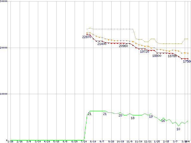 ※このグラフは過去のデータも税率5%相当に調整した税込み相当額のグラフです。 税率変更や、総額表示方式導入(2004年4月)の影響は除いています。 | | | ●凡例 | 最安値 (点線部は販売店未確認 または未調査) | 平均値 | 最高値 | ショップ数 |