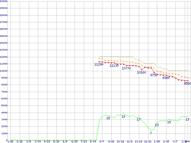 ※このグラフは過去のデータも税率5%相当に調整した税込み相当額のグラフです。 税率変更や、総額表示方式導入(2004年4月)の影響は除いています。 | | | ●凡例 | 最安値 (点線部は販売店未確認 または未調査) | 平均値 | 最高値 | ショップ数 |
