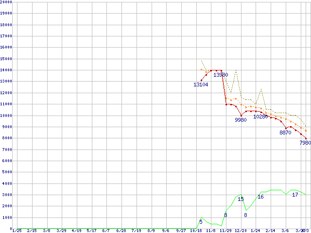 ※このグラフは過去のデータも税率5%相当に調整した税込み相当額のグラフです。 税率変更や、総額表示方式導入(2004年4月)の影響は除いています。 | | | ●凡例 | 最安値 (点線部は販売店未確認 または未調査) | 平均値 | 最高値 | ショップ数 |