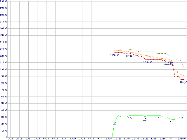 ※このグラフは過去のデータも税率5%相当に調整した税込み相当額のグラフです。 税率変更や、総額表示方式導入(2004年4月)の影響は除いています。 | | | ●凡例 | 最安値 (点線部は販売店未確認 または未調査) | 平均値 | 最高値 | ショップ数 |