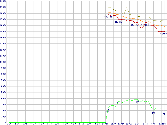 ※このグラフは過去のデータも税率5%相当に調整した税込み相当額のグラフです。 税率変更や、総額表示方式導入(2004年4月)の影響は除いています。 | | | ●凡例 | 最安値 (点線部は販売店未確認 または未調査) | 平均値 | 最高値 | ショップ数 |