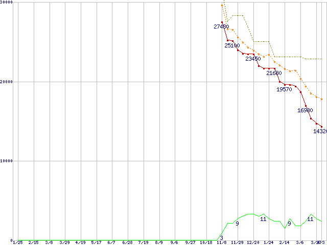 ※このグラフは過去のデータも税率5%相当に調整した税込み相当額のグラフです。 税率変更や、総額表示方式導入(2004年4月)の影響は除いています。 | | | ●凡例 | 最安値 (点線部は販売店未確認 または未調査) | 平均値 | 最高値 | ショップ数 |