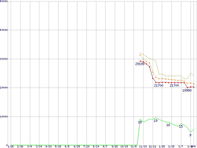 ※このグラフは過去のデータも税率5%相当に調整した税込み相当額のグラフです。 税率変更や、総額表示方式導入(2004年4月)の影響は除いています。 | | | ●凡例 | 最安値 (点線部は販売店未確認 または未調査) | 平均値 | 最高値 | ショップ数 |