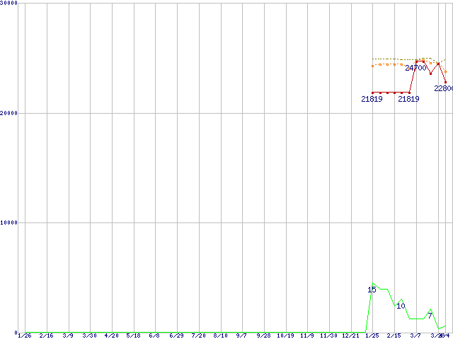 ※このグラフは過去のデータも税率5%相当に調整した税込み相当額のグラフです。 税率変更や、総額表示方式導入(2004年4月)の影響は除いています。 | | | ●凡例 | 最安値 (点線部は販売店未確認 または未調査) | 平均値 | 最高値 | ショップ数 |