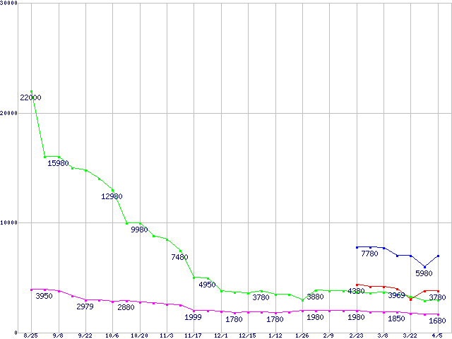 PC2-6400(DDR2-800) DDR2 SDRAM DIMMの最安値推移