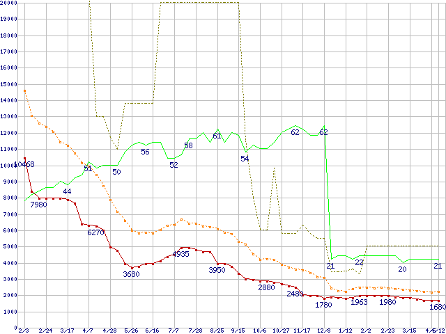 ※このグラフは過去のデータも税率5%相当に調整した税込み相当額のグラフです。 税率変更や、総額表示方式導入(2004年4月)の影響は除いています。 | | | ●凡例 | 最安値 (点線部は販売店未確認 または未調査) | 平均値 | 最高値 | ショップ数 |