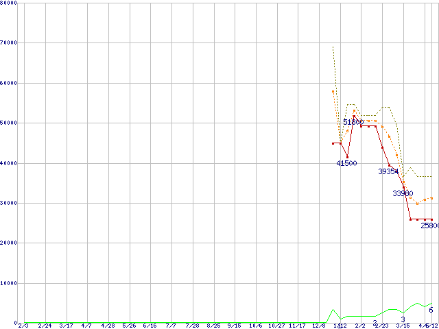 ※このグラフは過去のデータも税率5%相当に調整した税込み相当額のグラフです。 税率変更や、総額表示方式導入(2004年4月)の影響は除いています。 | | | ●凡例 | 最安値 (点線部は販売店未確認 または未調査) | 平均値 | 最高値 | ショップ数 |