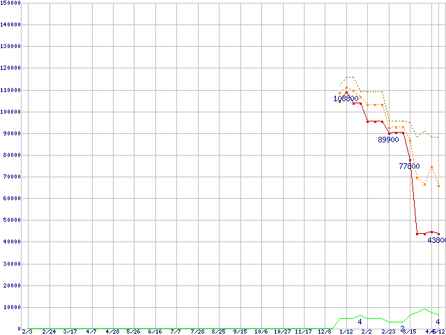 ※このグラフは過去のデータも税率5%相当に調整した税込み相当額のグラフです。 税率変更や、総額表示方式導入(2004年4月)の影響は除いています。 | | | ●凡例 | 最安値 (点線部は販売店未確認 または未調査) | 平均値 | 最高値 | ショップ数 |