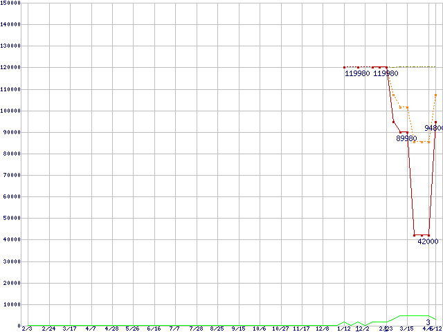 ※このグラフは過去のデータも税率5%相当に調整した税込み相当額のグラフです。 税率変更や、総額表示方式導入(2004年4月)の影響は除いています。 | | | ●凡例 | 最安値 (点線部は販売店未確認 または未調査) | 平均値 | 最高値 | ショップ数 |